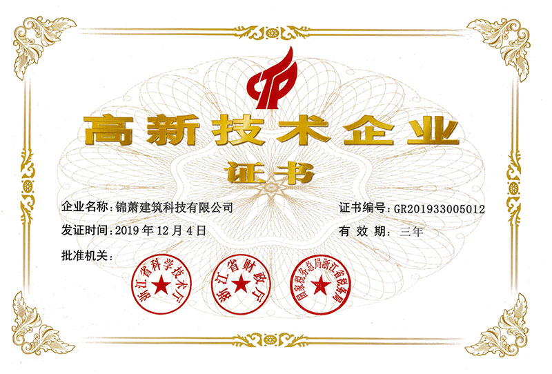 2019年12月,錦蕭建筑科技有限公司成功通過高新技術(shù)企業(yè)認(rèn)定,并于近日收到由浙江省科學(xué)技術(shù)廳、浙江省財(cái)政廳及國家稅務(wù)總局浙江省稅務(wù)局頒發(fā)的“高新技術(shù)企業(yè)”證書。