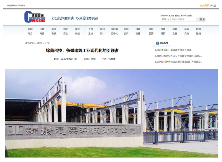 2020年5月18日,《建筑時報》第3724期第5版,刊登了《爭做建筑工業現代化的引領者——錦蕭建筑科技有限公司走訪記》一文,對錦蕭建筑科技有限公司進行了大篇幅報道。
