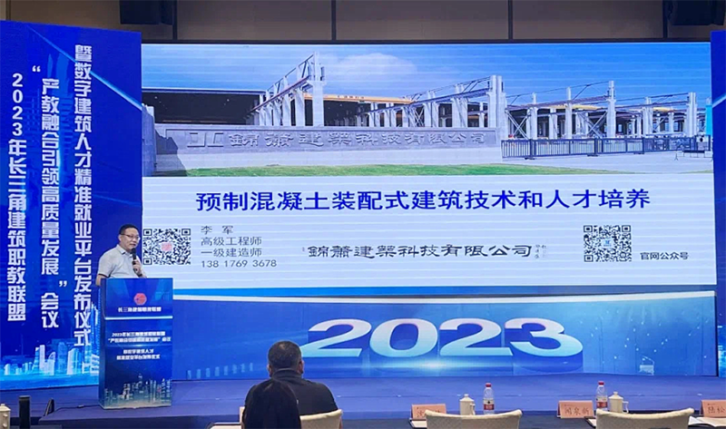 在2023年長三角建筑職教聯盟“產教融合引領高質量發展”會議暨數字建筑人才精準就業平臺發布儀式上,錦蕭科技成為長三角建筑職教聯盟新成員,李軍受邀作關于預制混凝土裝配式建筑技術和人才培養的專題講座。同時,作為該領域專家,李軍對全上海和浙江省住建廳質監系統培訓作《預制裝配式整體剪力墻建筑的質量控制要點》的講課。