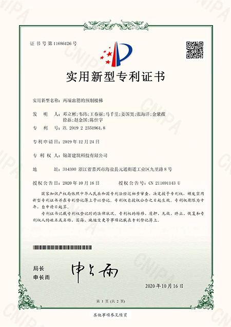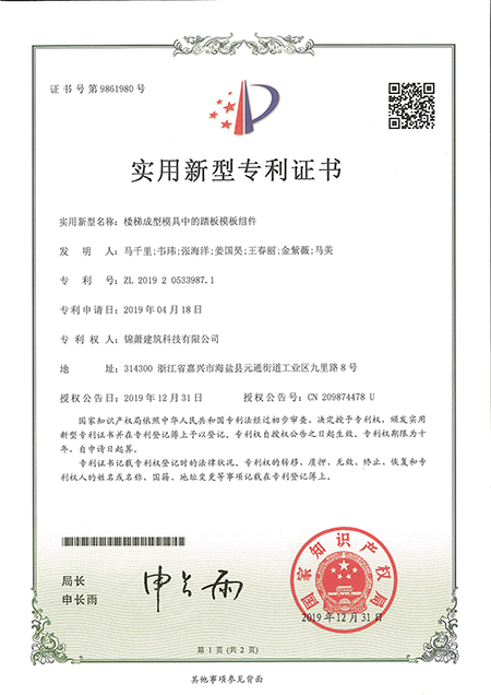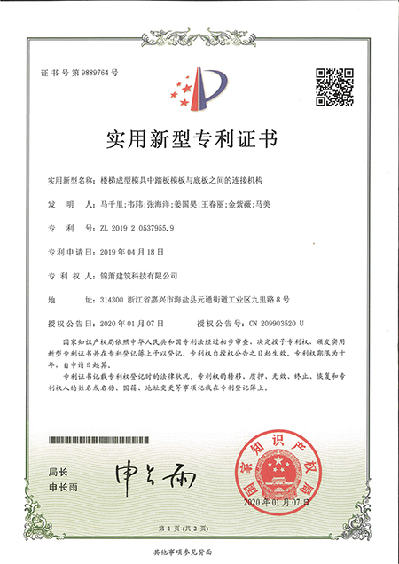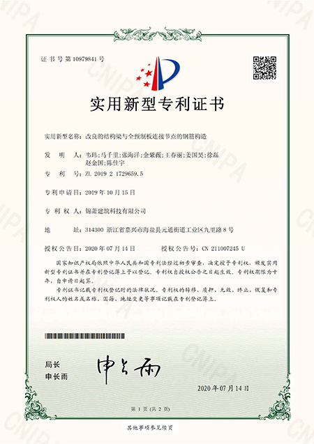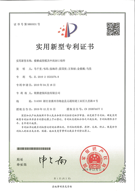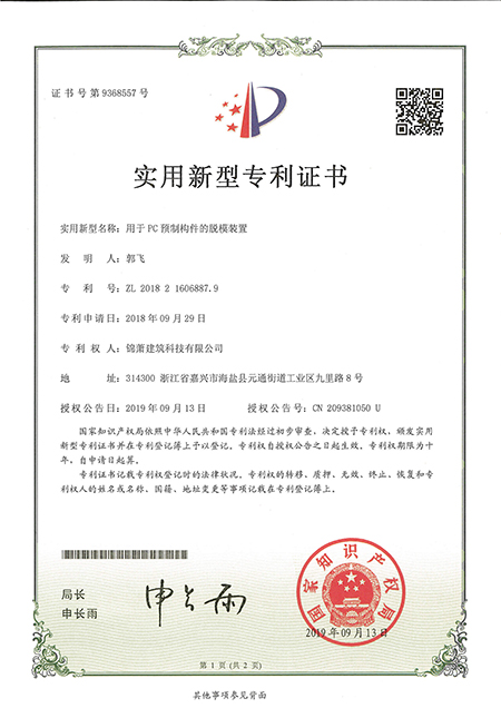 專利證書--用于PC預(yù)制構(gòu)件的脫模裝置